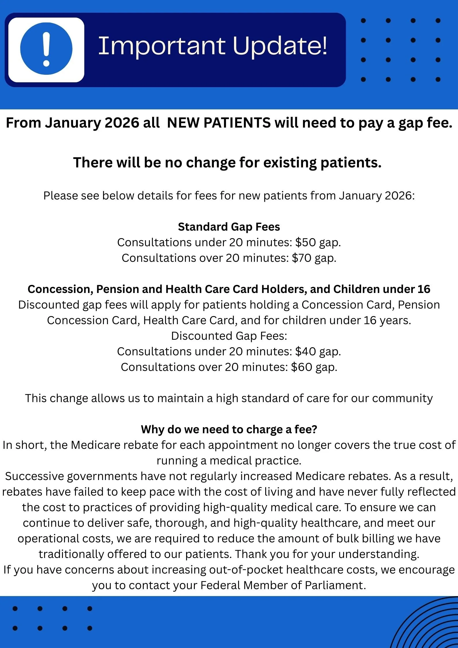 We have had many New Patients make appointments and then not come in. We now require a deposit of $50 to be made at the time of booking. This can be transferred to your fees after seeing the doctor. If you are eligible to be bulk billed for your consult this will be refunded at your appointment unless the service cannot be bulk billed.